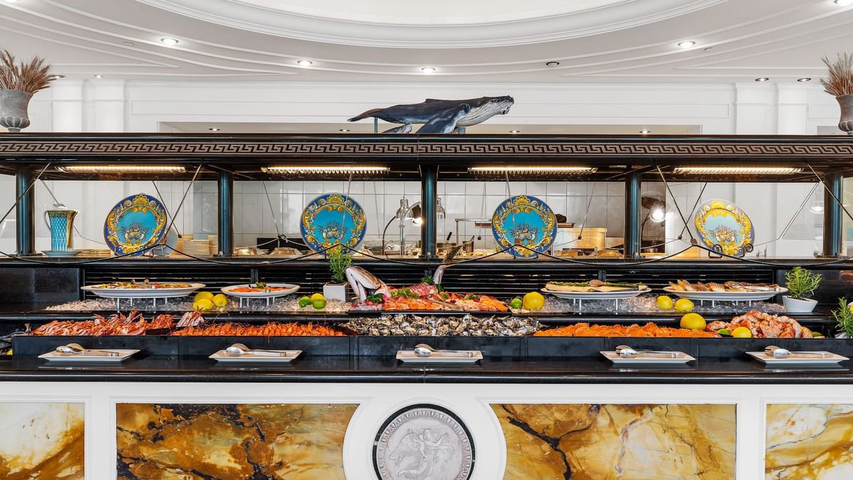 Indulge in a daily roast selection complete with Yorkshire puddings and all the classic trimmings, alongside an abundant spread of chilled seafood, artisan breads, fresh salads, antipasti, gourmet cheeses, decadent desserts, and more.