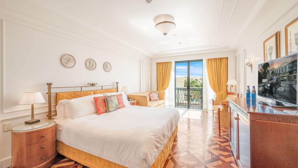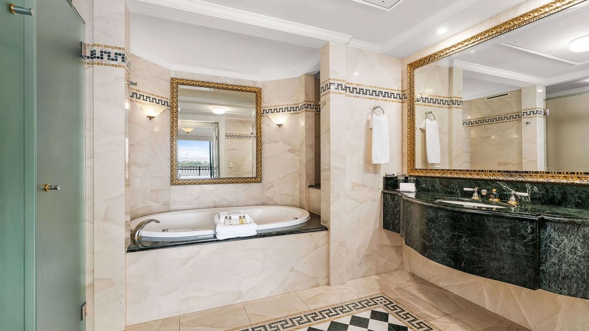 你只需斜依在复古的朱丽叶式阳台上,波光闪闪的范思哲泻湖便触手可及。你会爱上在自然晨光中醒来的感觉。阳光透过玻璃滑门投射在手工制作的拼花地板上,温暖自然地木制家具与房间舒缓的米色调相得益彰,构成范思哲跃然生动的调色盘。在双人Spa浴缸里享受泡泡浴的美妙时光,以及范思哲浴品的舒适体验。